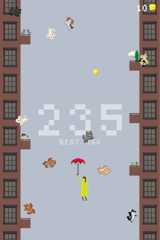 Avoid the raining cats and dogs as you fly up through the sky collecting coins. Your umbrella provides some protection, but it's not indestructible.